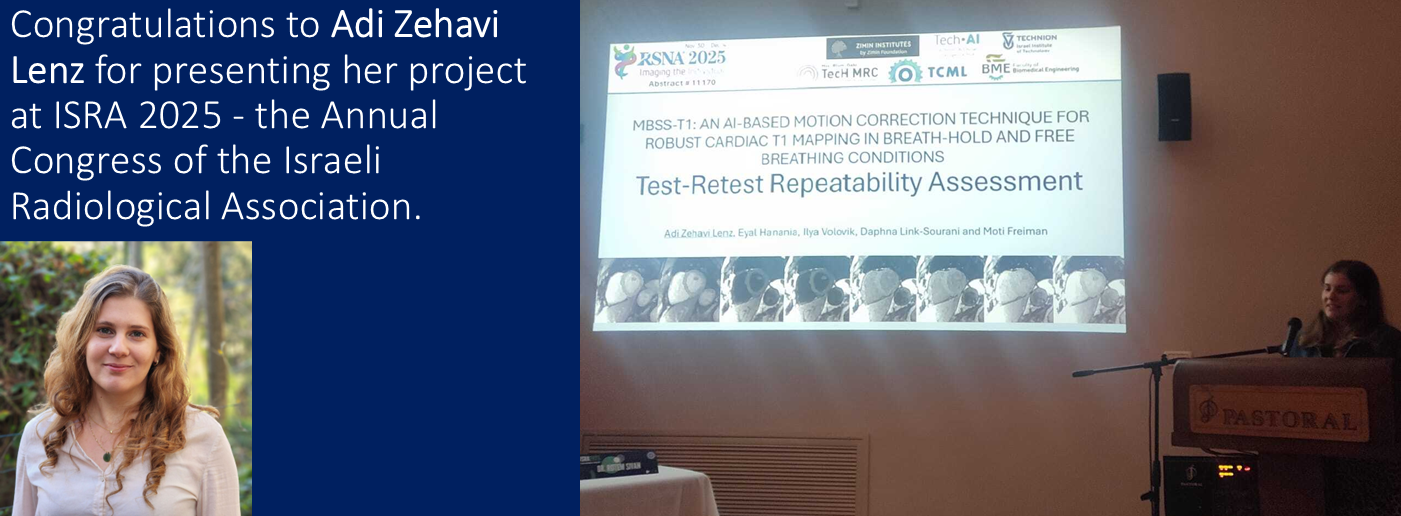 Congratulations to Adi Zehavi Lenz for presenting her project, MBSS-T1: An AI-based Motion Correction Technique For Robust Cardiac T1 Mapping In Breath-hold And Free-breathing Conditions - Test-retest Repeatability Assessment, at ISRA 2025 - the Annual Congress of the Israeli Radiological Association!