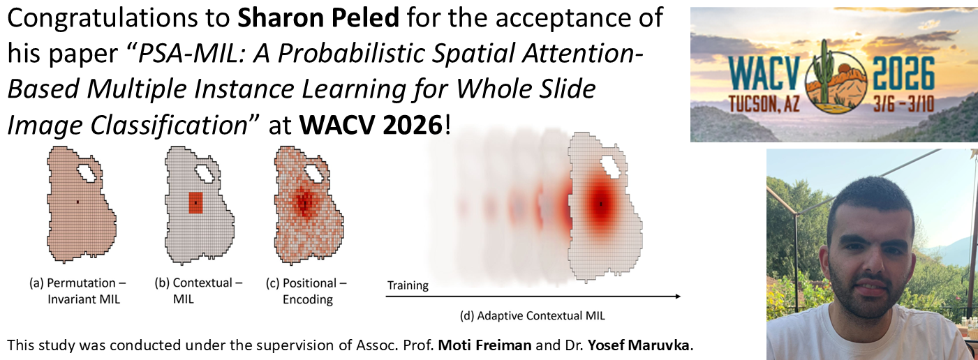 Congratulations to Sharon Peled for the acceptance of his paper “PSA-MIL: A Probabilistic Spatial Attention-Based Multiple Instance Learning for Whole Slide Image Classification” at WACV 2026! ArXiv LinkGithub